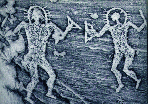 Uma pintura de caverna encontrada na Itália, os defensores da teoria dizem que está representando os Antigos Astronautas visitando a Terra. Esta imagem foi provavelmente a inspiração para a pintura rupestre encontrada em Prometheus.